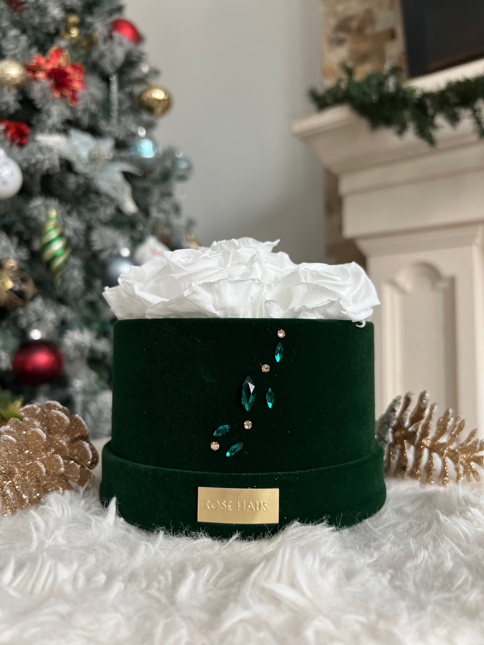 A handcrafted statement piece featuring 6 premium Ecuadorian preserved XL roses in white arranged in a soft petite velvet box 5.5" diameter and finished with authentic Swarovski® crystals in our signature Rose Haus patterns. Each box is uniquely embellished using Navette, Diamond, and other precision-cut crystals for a brilliant, one-of-a-kind sparkle.